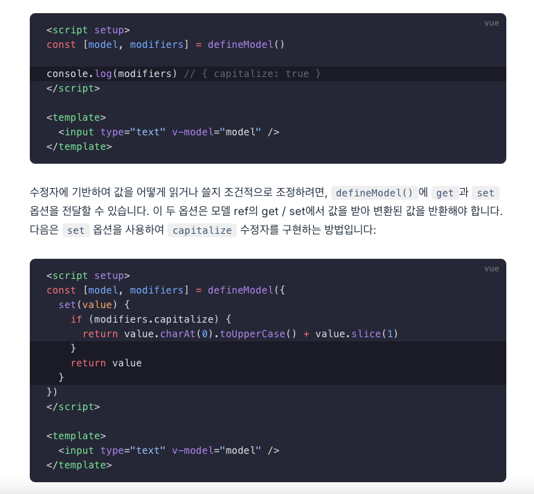 하나의 v-model 수정자를 이용해 set, get과 같은 옵션을 사용하는법이 소개 되지만, 다중 v-model의 사용했을 때, 수정자를 받는 받식만 소개되고 set과 같은 옵션을 사용할 수 있는 방법이 빠져있어 추가 해본다.