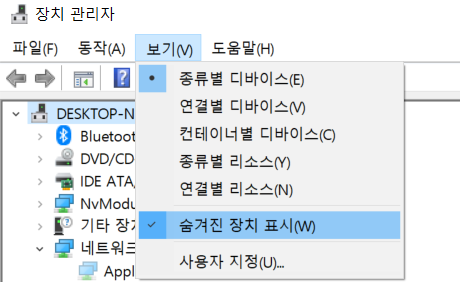์ ์ฌ์ง์ฒ๋ผ ๋ณด๊ธฐ ํญ -> ์จ๊ฒจ์ง ์ฅ์น ํ์๋ฅผ ํ์ ๋, ๋ฐํฌ๋ช ์ํ์ ์์ด์ฝ๋ค์ด ์๋ก ์๊ฒจ๋๋๋ฐ ์ฌ๊ธฐ์ ๋ฐํฌ๋ช ์ฒ๋ฆฌ(์จ๊ฒจ์ง)๋ก wireless ํน์ WLAN์ด๋ผ๋ ์ด๋ฆ์ด ํฌํจ๋ ์ฅ์น๊ฐ ์๋ค๋ฉด, ๋๋ผ์ด๋ฒ๊ฐ ์ ๋๋ก ์ค์น๋์ง ์์์ ์ฌ์ฉ๋์ง ์๋ ์ํ์ด๋ค.