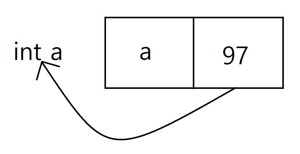 ๋ณ์ a์ ์ฌ์ฉ์ ์ ๋ ฅ์ผ๋ก ๋ฌธ์ 'a'๋ฅผ ๋ฐ์ผ๋ฉด ๋ฌธ์ 'a'์ ์์คํค์ฝ๋ ๊ฐ์ด 97์ด a ๋ณ์์ ์ ์ฅ๋๋ค.
