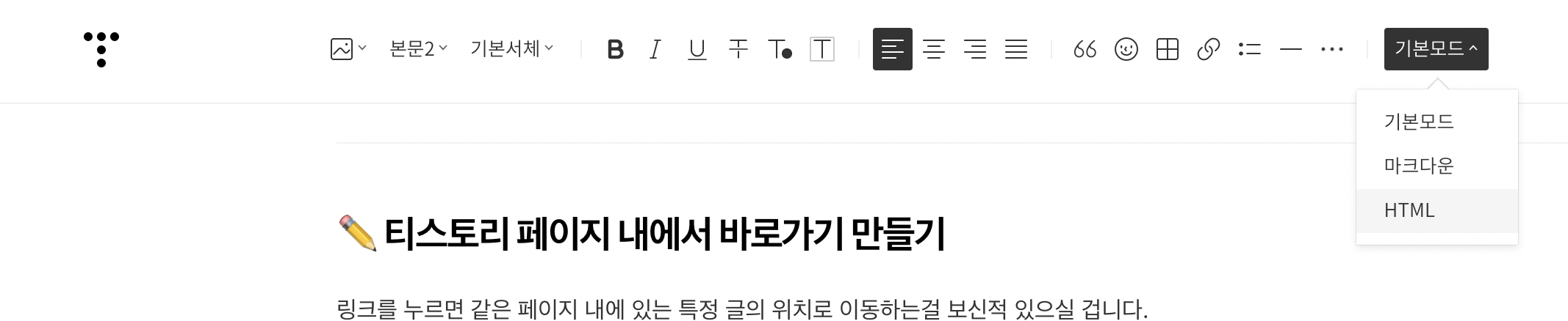 ํฐ์คํ ๋ฆฌ๋ ๊ธ์ ์์ฑํ ๋, ๊ธฐ๋ณธ๋ชจ๋ ์ด ์ธ์์ HTML์ ์ง์ ์์ ํ ์ ์๊ฒ๋ ์ ๊ณต๋ฉ๋๋ค. ์ผ๋จ HTML์ ๋๋ฌ๋ด ๋๋ค.